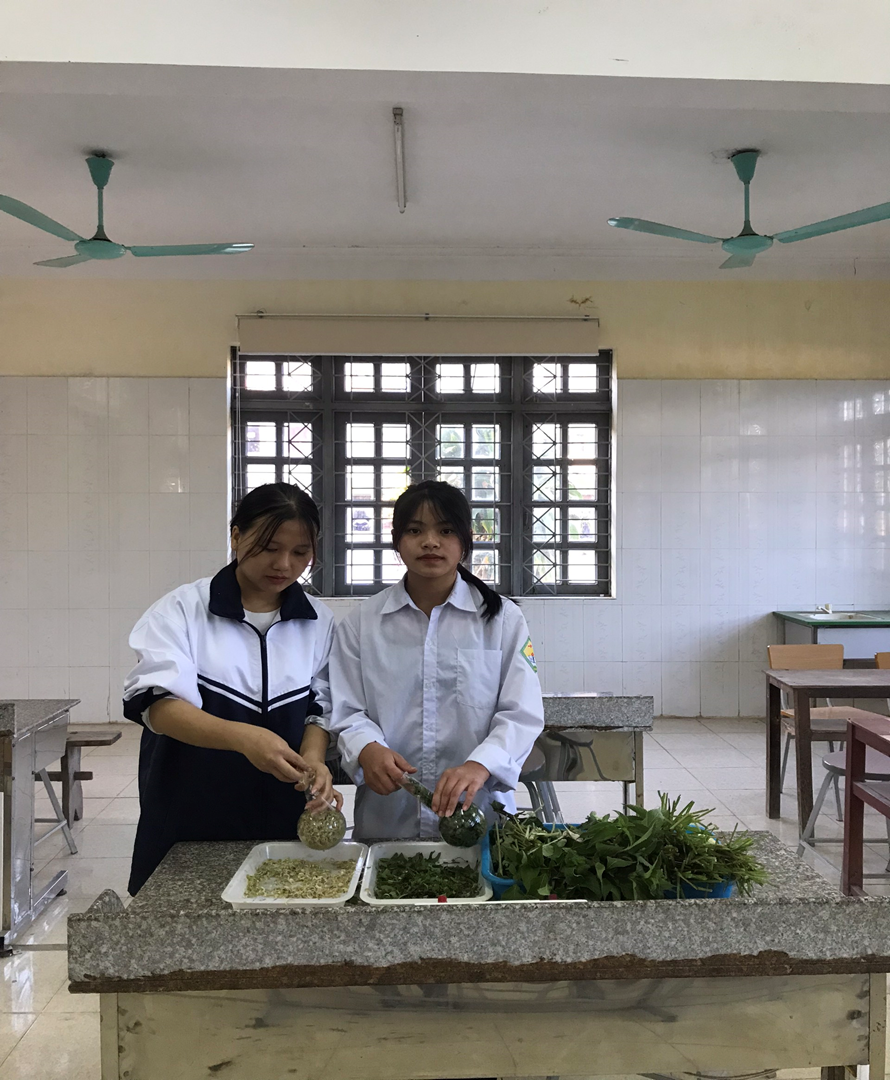 Học sinh Trần Thị Ngọc Ánh và Vì Thị Biến đang thực hiện dự án.