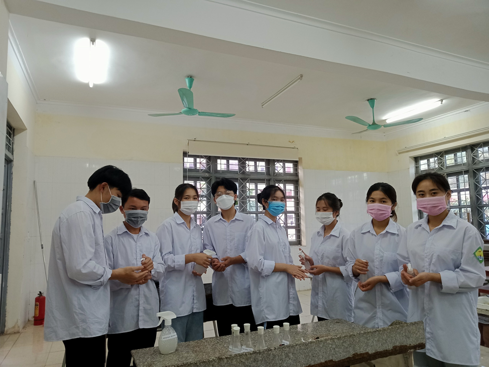 Các em học sinh cùng nhau sử dụng sản phẩm dung dịch sát khuẩn tham gia dự thi.