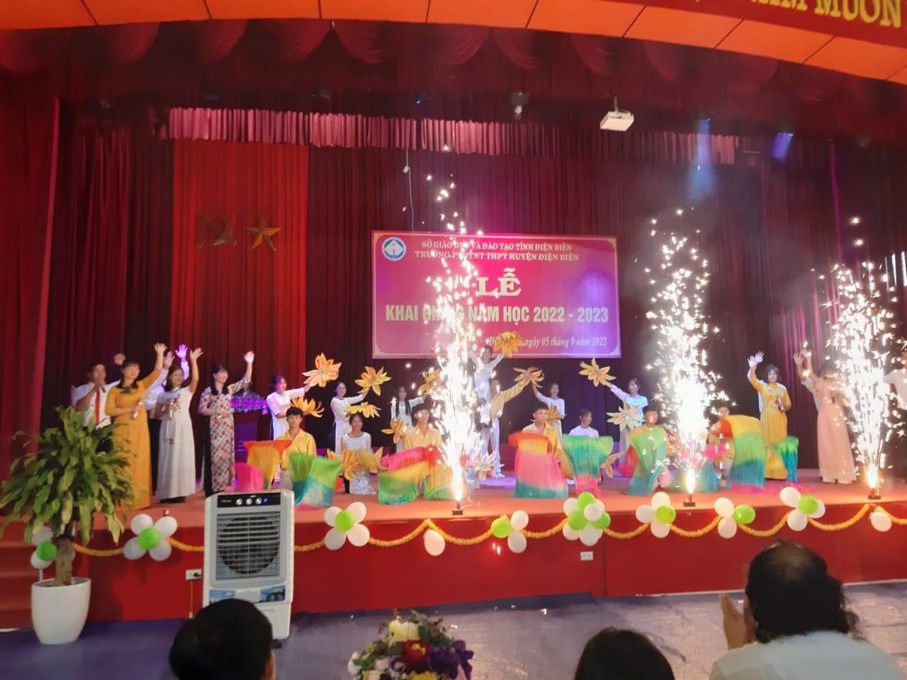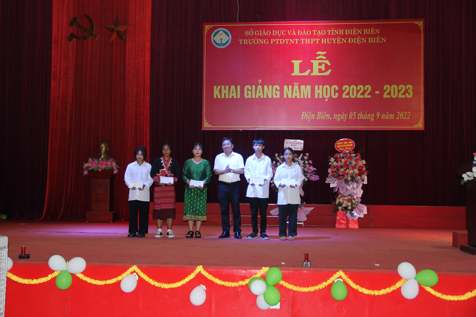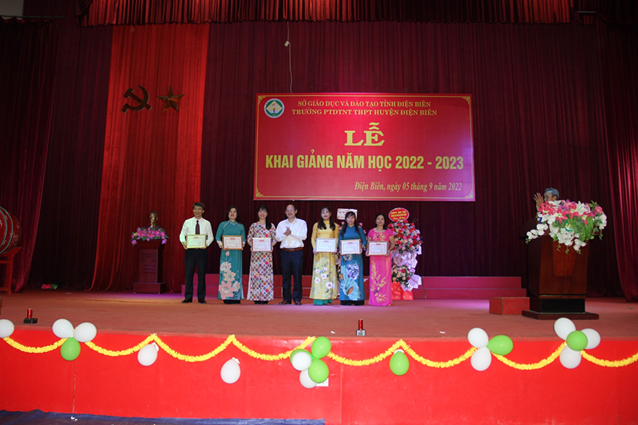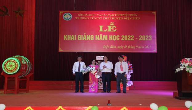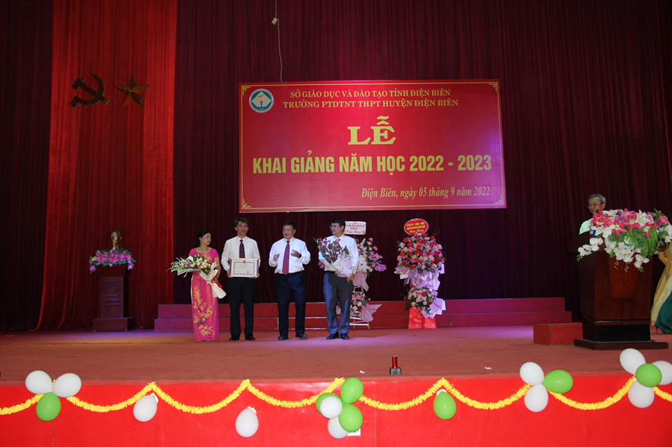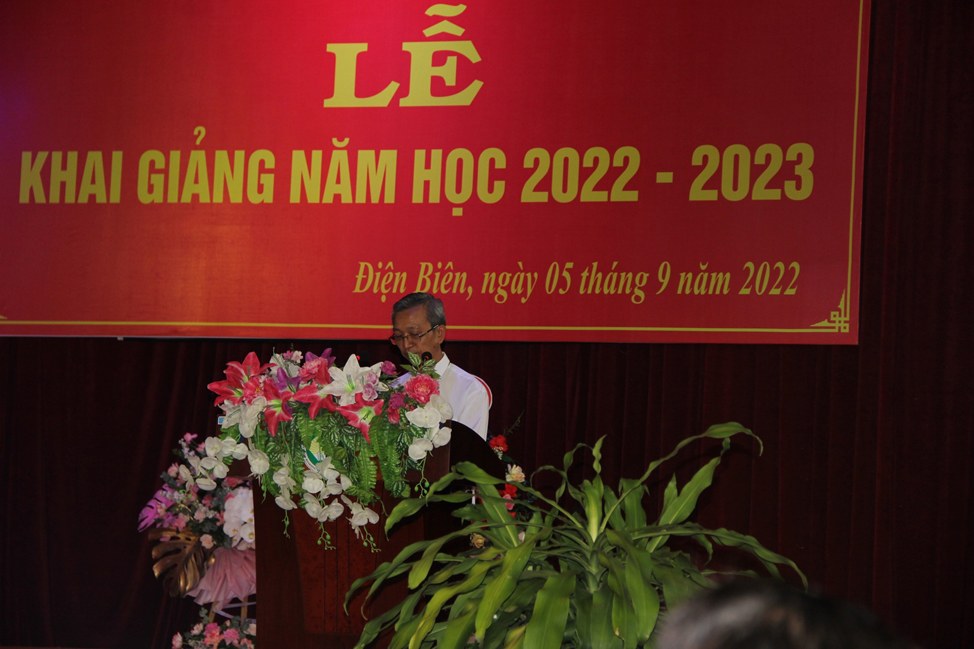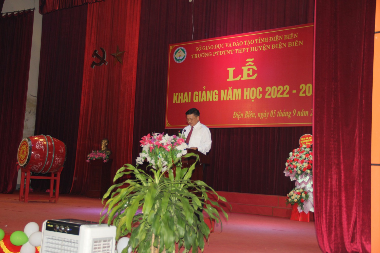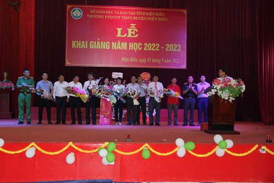 Phát biểu tại Lễ khai giảng, đồng chí Cù Huy Hoàn - Phó Giám đốc Sở Giáo dục và Đào tạo Điện Biên gửi lời chúc mừng năm học mới đến toàn thể cán bộ quản lý, giáo viên, nhân viên và học sinh nhà trường. Đồng thời biểu dương những thành tích nhà trường đạt được trong năm học vừa qua, chỉ đạo cấp ủy, Ban Giám hiệu nhà trường tiếp tục lãnh đạo trường thực hiện tốt các nhiệm vụ năm học 2022-2023, tặng hoa chúc mừng và trao danh hiệu Chiến sĩ thi đua cơ sở cho CBQL, giáo viên nhà trường