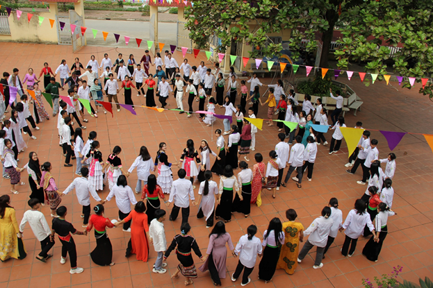 Sau Lễ Khai giảng, đại biểu và thầy trò nhà trường cùng hân hoan trong Điệu xòe.