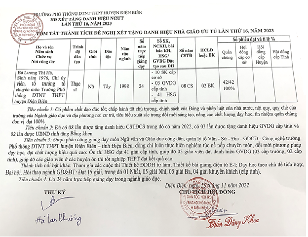 Trường Phổ thông DTNT THPT huyện Điện Biên tổ chức thăm dò dư luận trong toàn thể viên chức, người lao động, phụ huynh học sinh, học sinh toàn trường về việc xét tặng danh hiệu “Nhà giáo Ưu tú” lần thứ 16 - năm 2023 cho 01 nhà giáo (có trích nganh thành tích kèm theo).